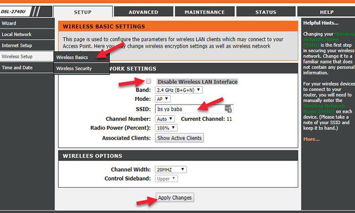 1- نضغط علي Wireless Setup ثم Wireless Basics ثم نقوم بتغيير إسم الشبكة من خلال الخانة SSID لإسهم سهل حتي يسهل تذكره