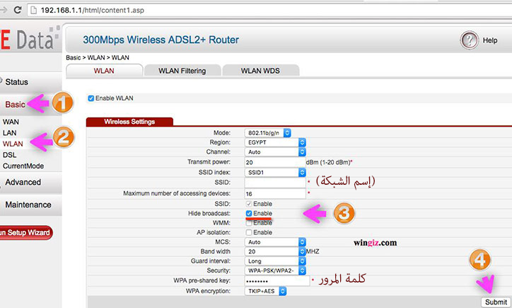 إخفاء شبكة الواي فاي لراوتر TE DATA القديم