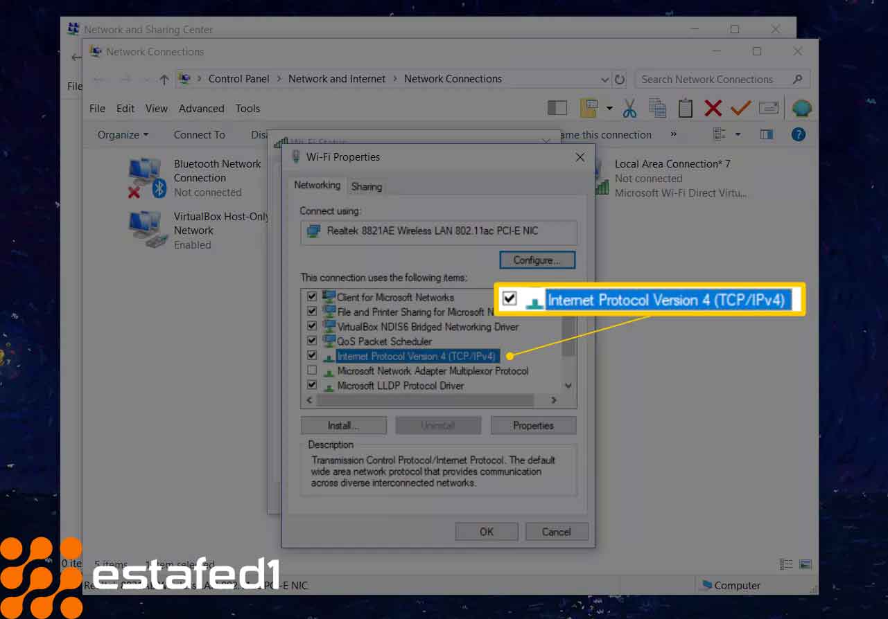 8. ومن نافذة خصائص الإتصال التى ظهرت، انقر على خيار (Internet Protocol Version 4 (TCP/IPv4.